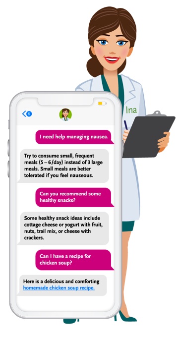- You can text Ina® any time to get tips to manage your side effects, recipes, recommended foods to eat or avoid, and other tips.